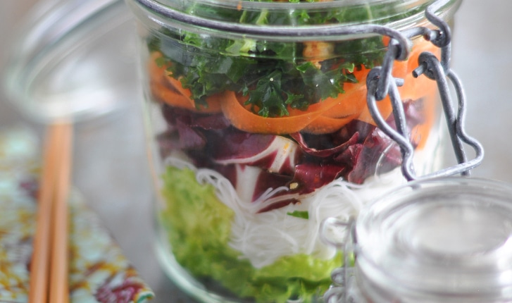 Un bon bol de légumes frais au poulet pour déjeuner équilibré au bureau, et se régaler ! Chou kale, carotte, salades, nouilles de riz, poulet... il a tout du bo bun ce bol frais à emporter !
