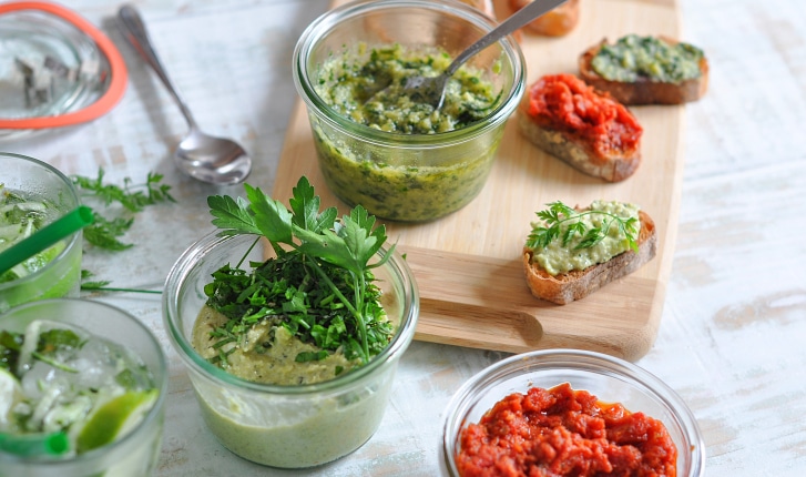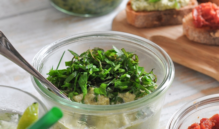 A tartiner ! Le houmous de brocoli à servir avec des herbes fraîches ciselées. Une version toute verte du houmous libanais.