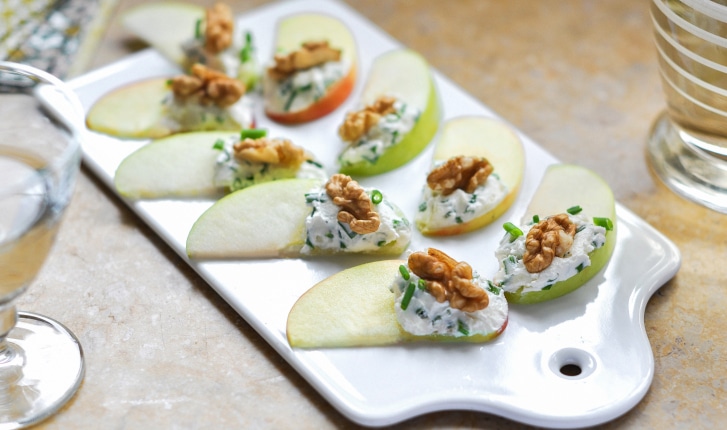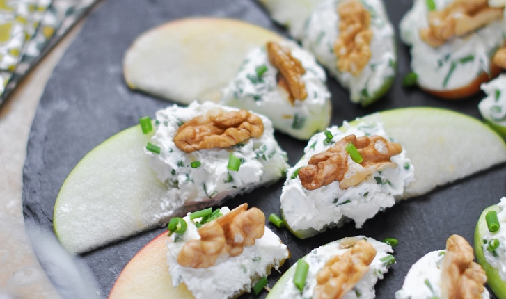 En quelques instants, préparez une bouchée à la fois fraîche et gourmande avec des tranches de pomme garnies de fromage frais à la ciboulette et aux noix.