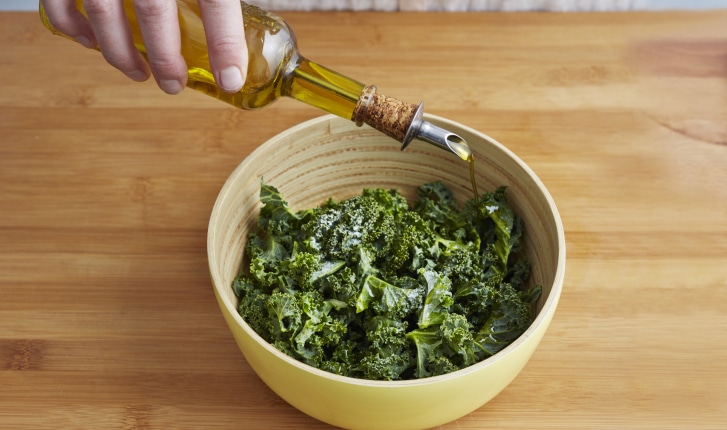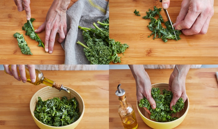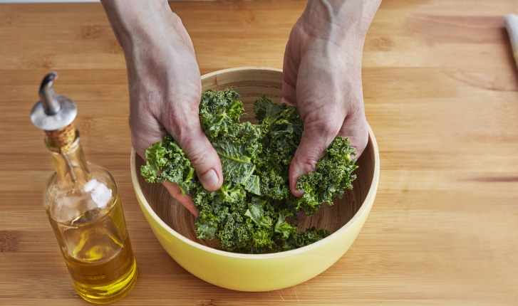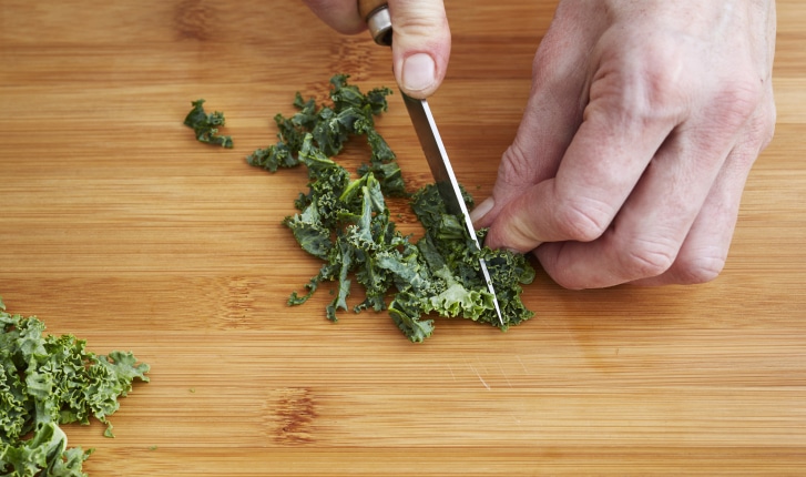 Simple et rapide, la technique pour préparer le chou kale avant de le cuisiner (cru ou cuit). Oter la nervure centrale. Ciseler. Arroser d'un filet d'huile d'olive. Brasser.