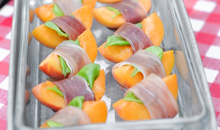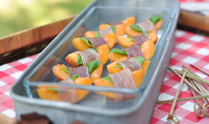 En bouchée apéritive ou en entrée, accompagné d'une salade verte, savourez des tranches d'abricot enveloppées dans du jambon cru et parfumées de basilic frais.