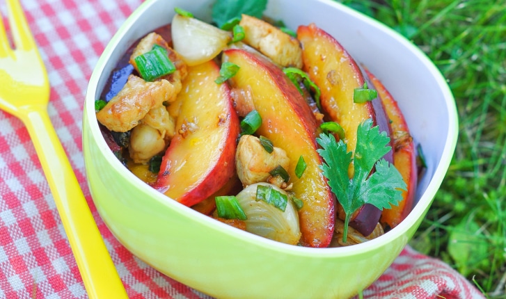 En deux temps trois mouvements un savoureux sauté de nectarines émincées au poulet, aux cacahuètes et à la coriandre, à déguster chaud à la maison ou froid en pique-nique.
