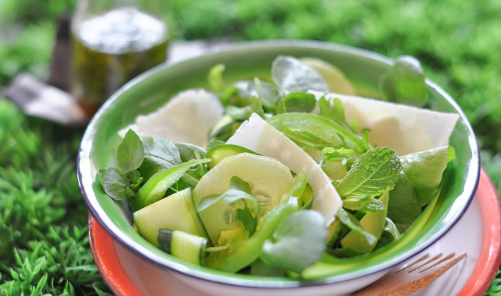 La fraîcheur au menu avec cette salade à base de courgette, concombre, poivron, menthe fraîche, et parmesan en pétales.