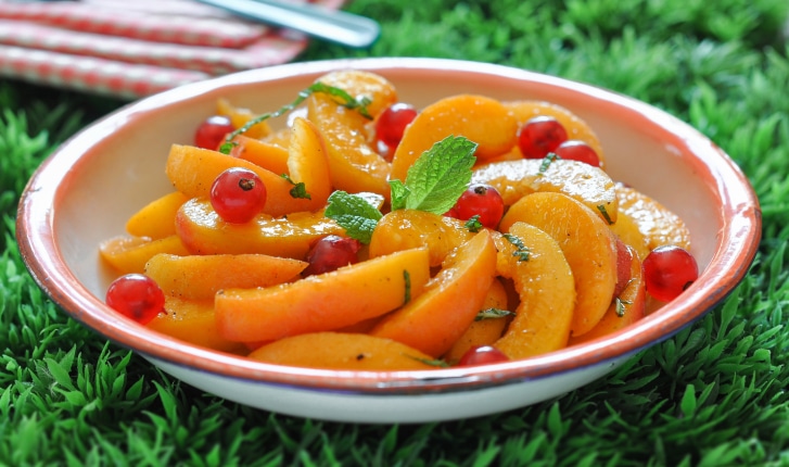 La fraîcheur au menu avec cette salade d'abricots et groseilles, parfumée de menthe fraîche et d'extrait de fleur d'oranger. A emporter, une salade d'abricot idéale pour le pique-nique