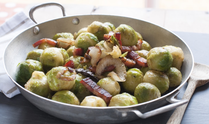Un grand classique pour le chou de Bruxelles qui s'associe au lard fumé et aux pruneaux pour accompagner un bon rôti (volaille, agneau, porc, etc.).