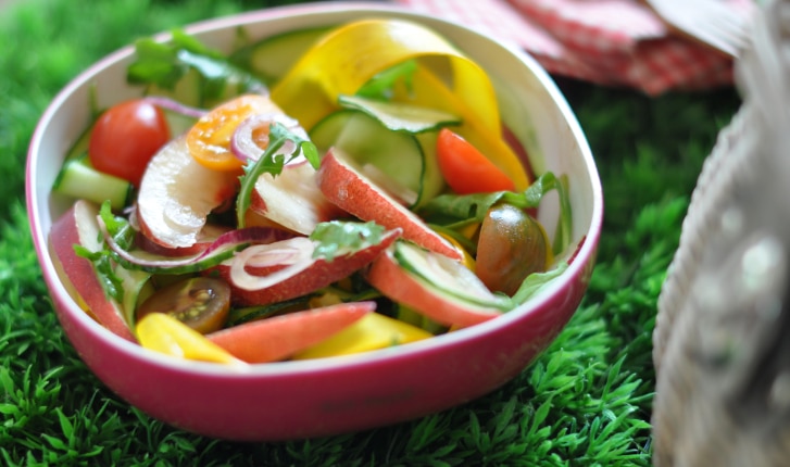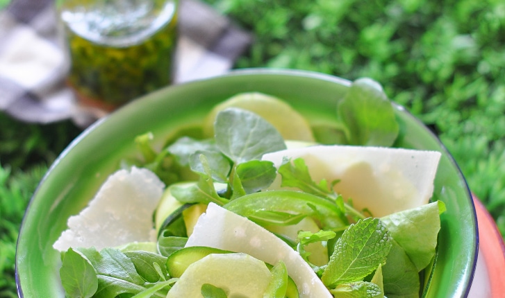 La fraîcheur au menu avec cette salade à base de courgette, concombre, poivron, menthe fraîche, et parmesan en pétales.