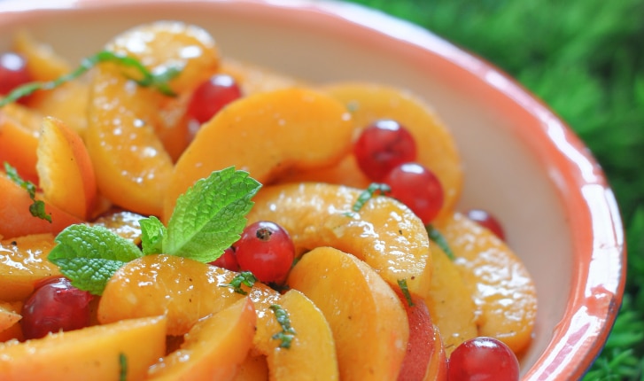 La fraîcheur au menu avec cette salade d'abricots et groseilles, parfumée de menthe fraîche et d'extrait de fleur d'oranger. A emporter, une salade d'abricot idéale pour le pique-nique