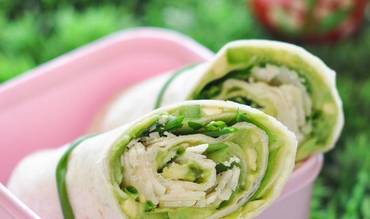 Pour le pique-nique, un wrap végétarien à base d'avocat, de courgette, de salade, agrémenté de pétales de parmesan. Un sandwich végétarien à emporter au bureau, en forêt, à la plage...