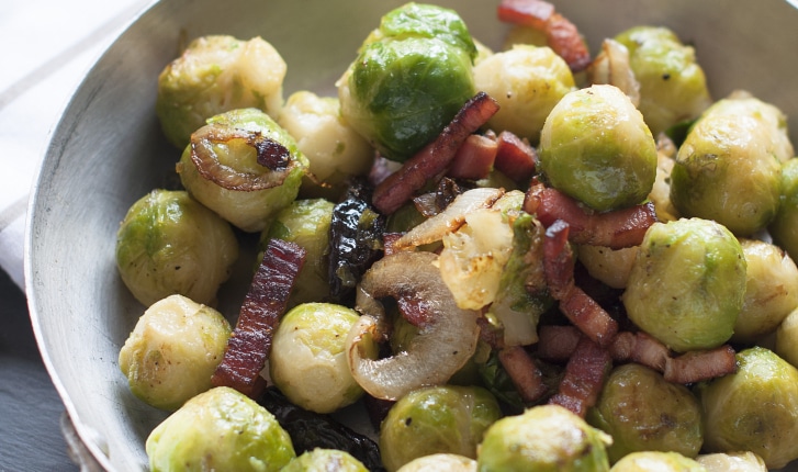 Un grand classique pour le chou de Bruxelles qui s'associe au lard fumé et aux pruneaux pour accompagner un bon rôti (volaille, agneau, porc, etc.).
