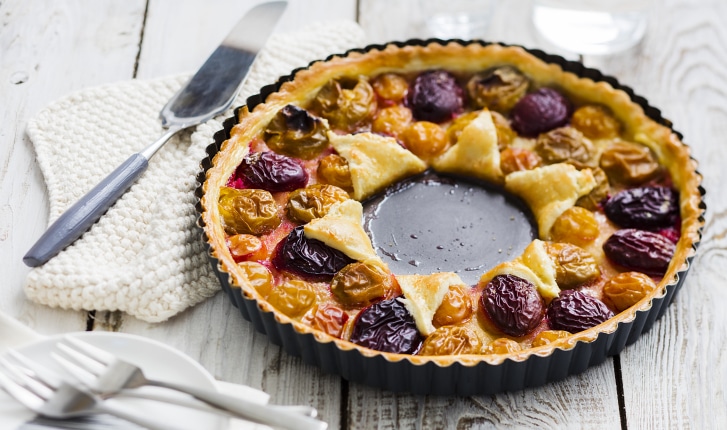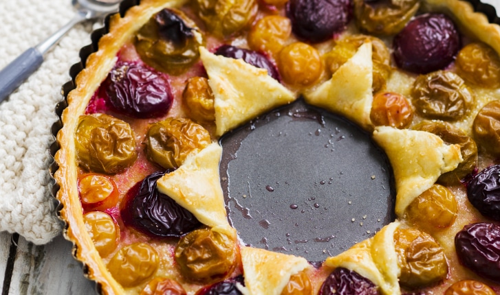 Une belle et bonne tarte aux prunes en forme de soleil pour célébrer la courte saison des mirabelles, des quetsches et des reine-claude.