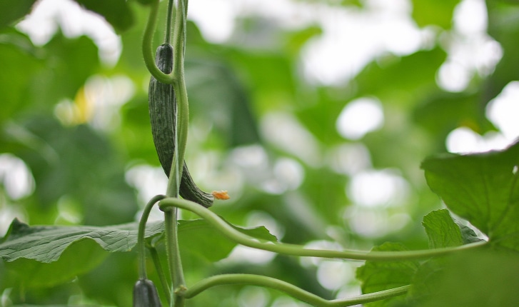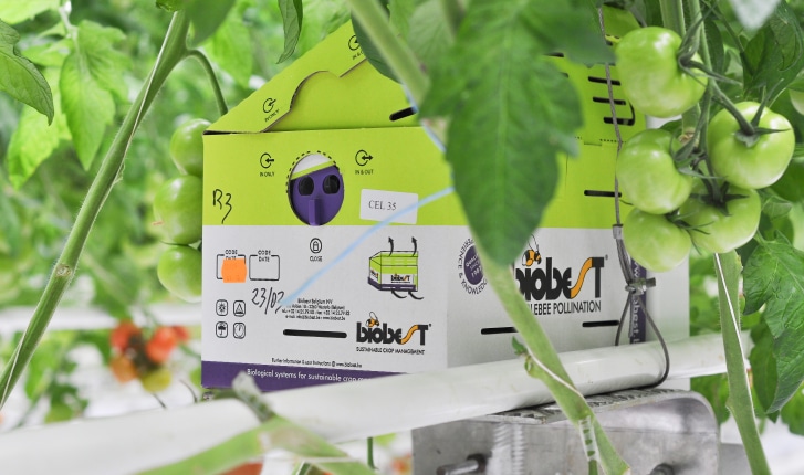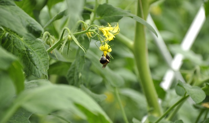 CTIFL – Serre d’expérimentation – Culture de tomates – Pollinisation d’une fleur de tomate Format : Paysage