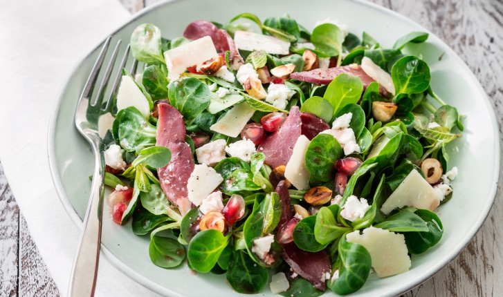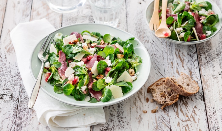 Simple et raffinée cette salade de mâche au magret fumé et à la féta rehaussée de "perles" de grenade. Une belle salade de mâche pour les fêtes ?