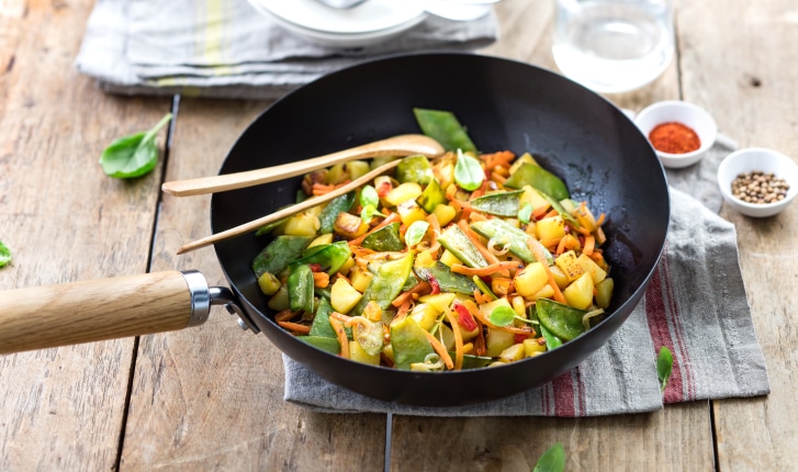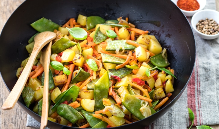 Une poêlée de légumes croquante et colorée (pois gourmands, poivron, oignons nouveaux, carotte, pommes de terre) cuisinés au wok, pour célébrer les beaux jours !