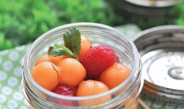 En deux temps trois mouvement une salade de melon et framboises rehaussée de citron et de menthe. Fraîcheur et saveurs au menu !