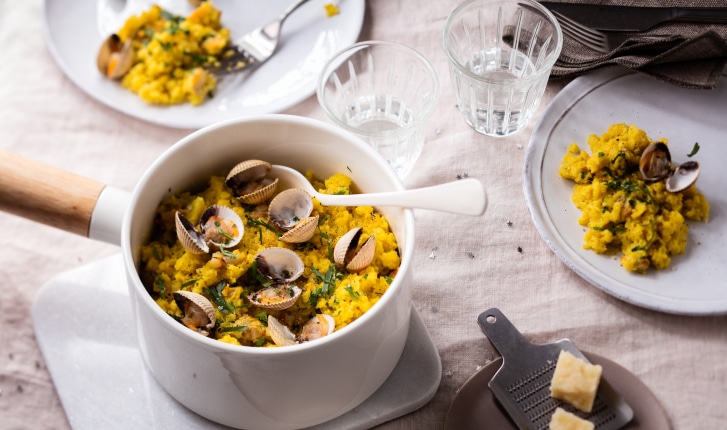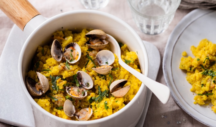 Un chouflotto qu'est-ce que c'est ? Du chou-fleur cuit comme un risotto et parfumé au safran et accompagné de coques. Un risotto de chou-fleur au safran et aux coques pour les fêtes.