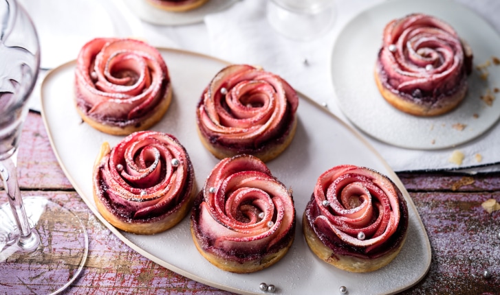 La tarte aux pommes revisitée pour les fêtes : offrez des roses ! Une rosace de pomme retenue dans une pâtes croustillante.
