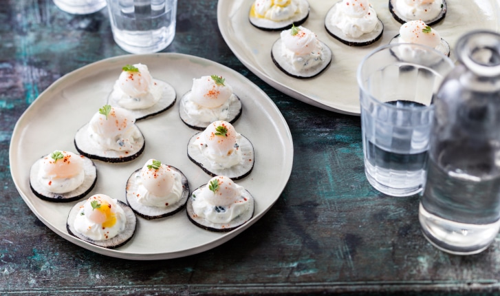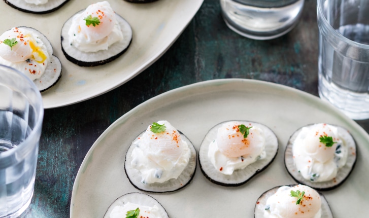 Craquante et élégante cette bouchée croquante de radis noir au fromage frais et aux herbes surmontées d'un œuf de caille poché !