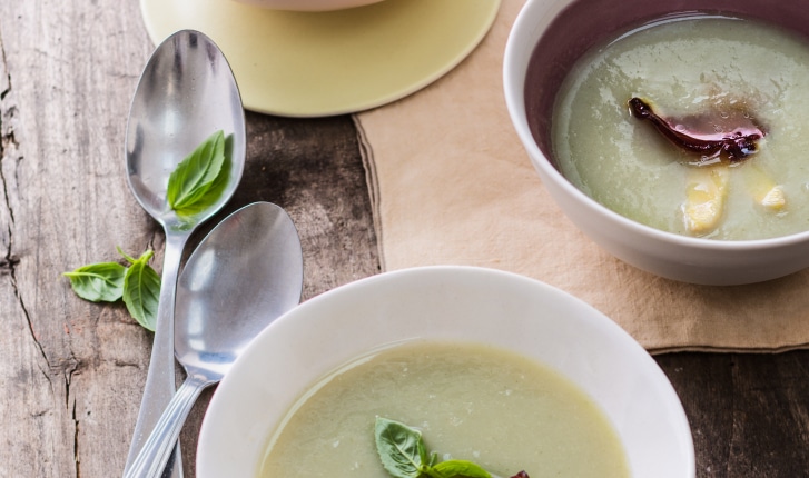 Une crème d'asperge à la fois raffinée et haute en saveurs, parfumée au basilic et agrémenté de magret fumé croustillant.