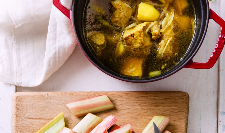 Pour célébrer le retour du printemps, un tajine de veau à la rhubarbe. L'acidité de la rhubarbe domptée par la cuisson et l'association avec le veau.