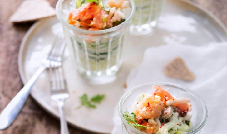 Une verrine fraîche et chic à base de concombre et de fruits de mer. A savourer aux heures chaudes.