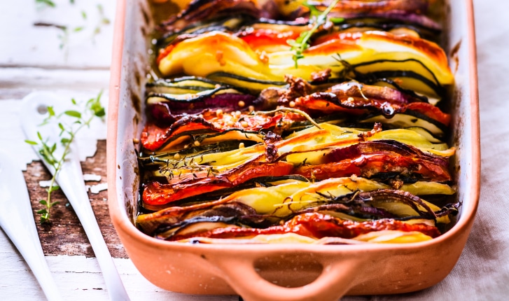 Tian de pommes de terre, tomates, courgettes et oignons rouges