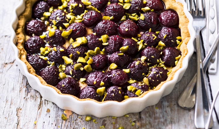 Une recette de tarte aux cerises originale et savoureuse, sur la base d'une pâte brisée additionnée de pâte de pistache.