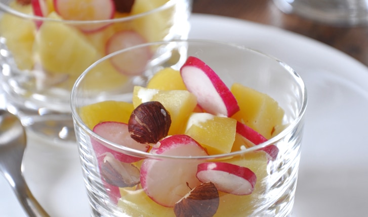 Salade de pommes de terre et radis, sauce wasabi et noisettes concassées
