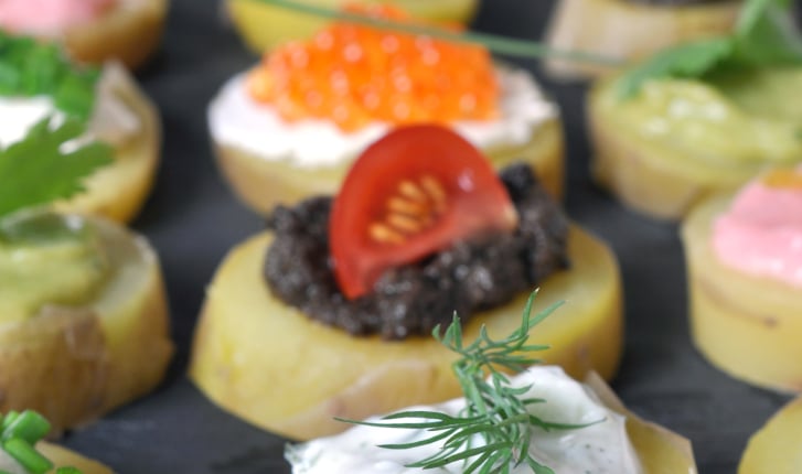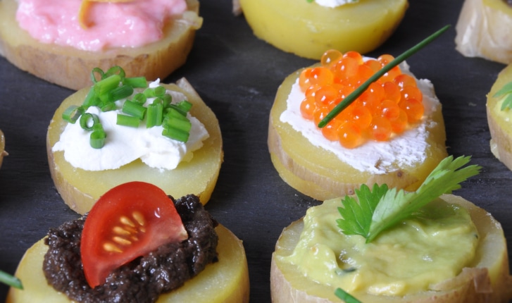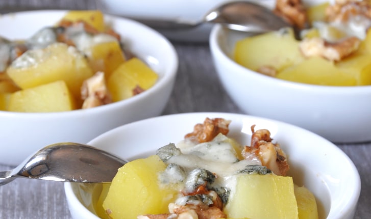 En deux temps trois mouvements de petites bouchées gourmandes aux pommes de terre, au roquefort et aux noix. Amuse-bouche, pièce de cocktail, entrée ou plat.