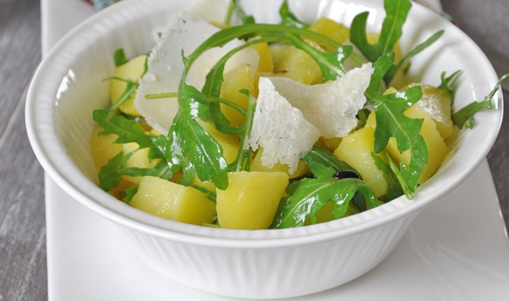 Une salade toute simple haute en saveurs. Pommes de terre en salade agrémentées de roquette et de pétales de parmesan.