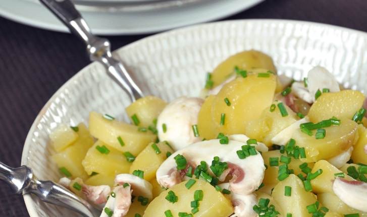Une salade de pommes de terre et champignons de Paris, parfumée de ciboulette fraîche et assaisonnée d'une vinaigrette à l'huile de noisette.