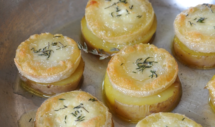 Tranches de pomme de terre cuite garnies de fromage de chèvre puis gratinées quelques instants sous le gril du four.