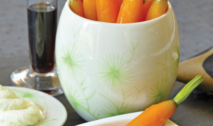 Des carottes glacées accompagnées d'une chantilly maison au wasabi et d'un caramel à la betterave rouge. La douceur de la carotte relevée par le piquant du wasabi.
