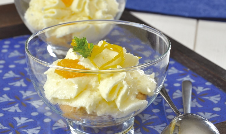 Un tiramisu à l'orange revisité. Une mousse à l'orange raffinée sur un lit de biscuits à la cuillère et parfumée de zestes d'orange confits.