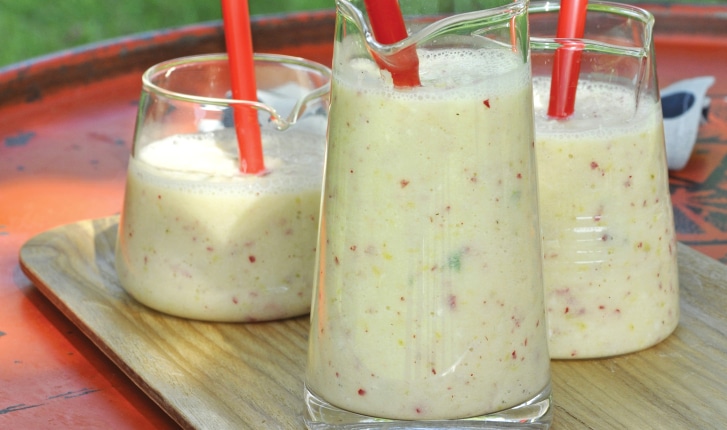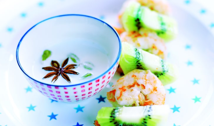 Recette sucrée-salée pour les enfants du Chef Olivier Chaput. Gambas et kiwis en brochettes de citronnelle pochées au lait de coco parfumé. Thaï. Brochette.