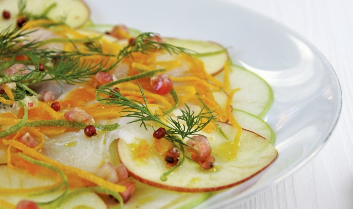 Carpaccio de pommes et haddock aux agrumes. Recette. Orange. Citron. Citron vert. Gala ou autre.