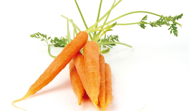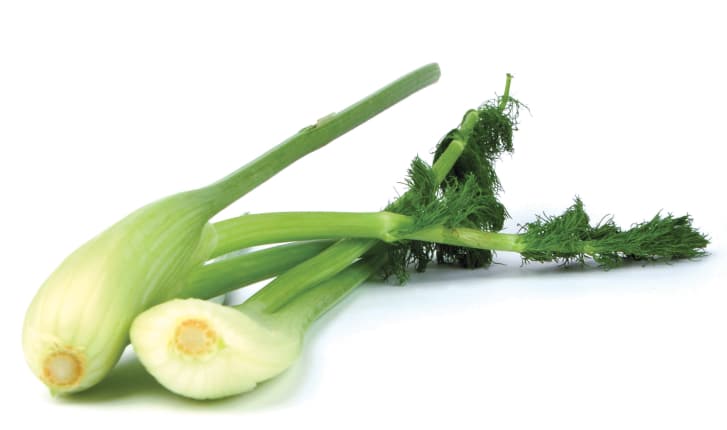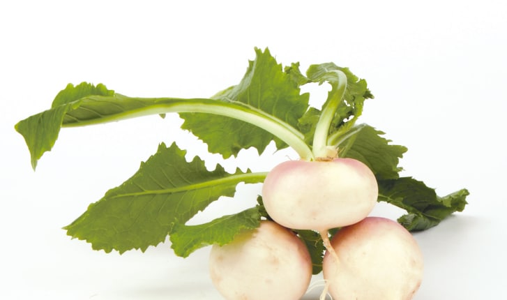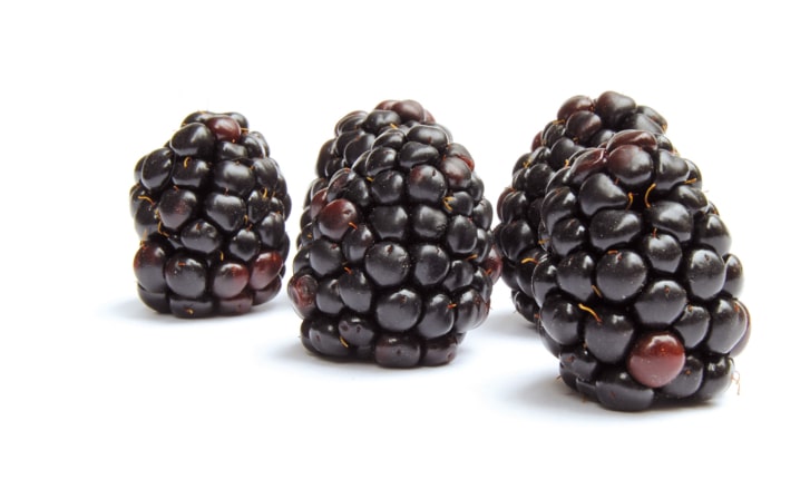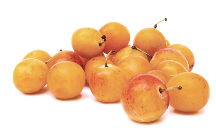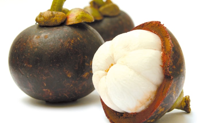 Mangoustans (fruits exotiques) dont un fruit partiellement débarrasé de son écorce, sur fond blanc.
