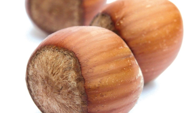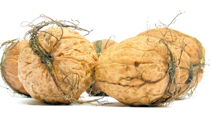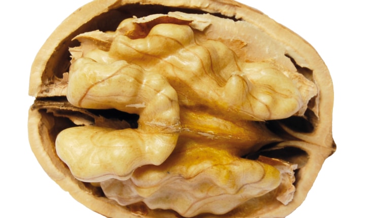 Gros plan cerneau de noix dans sa coque, sur fond blanc.