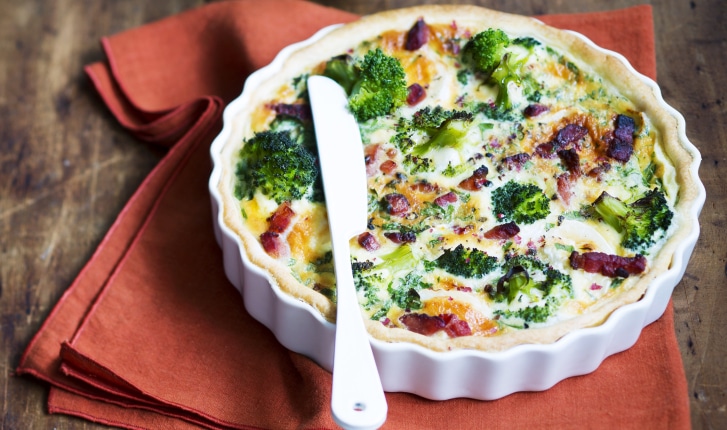 Tarte salée au brocoli, au chèvre et aux lardons fumés. A déguster chaude ou froide accompagnée d'une salade verte fraîche et croquante.