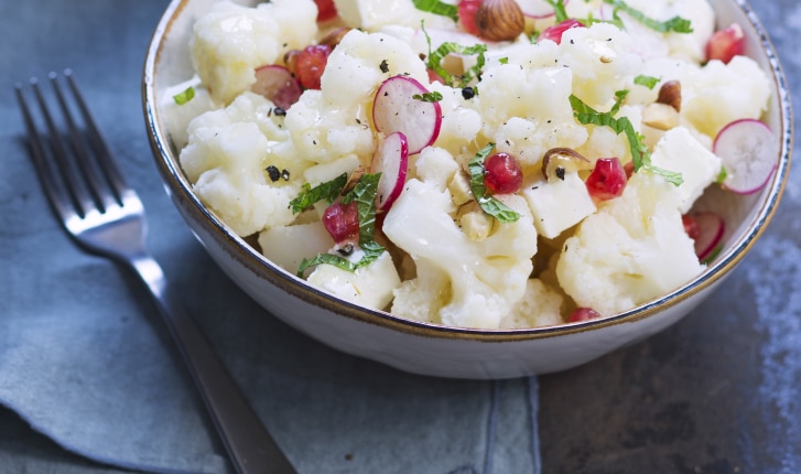 Une version originale, exotique de la salade de chou-fleur : chou-fleur cuit al dente agrémenté de dés de féta, de menthe fraîche, de grains de grenade et d'une vinaigrette à l'huile de sésame doré.