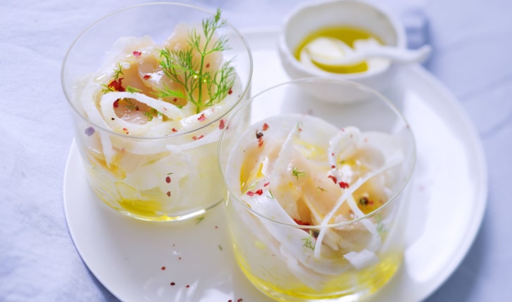 Fenouil très finement émincé accompagné de coquille saint Jacques en carpaccio, assaisonné au citron, l'huile d'olive, à l'aneth et aux baies roses.