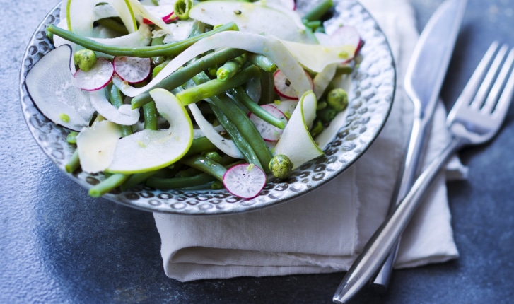 Salade fraîche et croquante à base de haricots verts, de pomme verte et de fenouil rehaussée d'une note piquante avec des petits pois croustillants au wasabi.