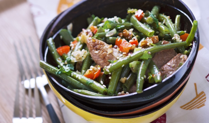 Un wok de haricots verts et d'agneau au poivron rouge et aux noisettes agrémenté de graines de sésame et parfumé de coriandre fraîche ciselée.