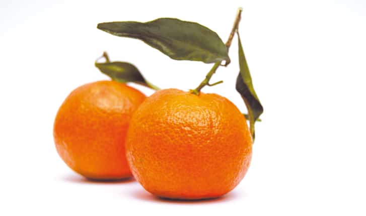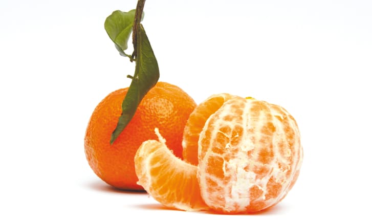 Clémentine de Corse (avec feuilles) sur fond blanc.