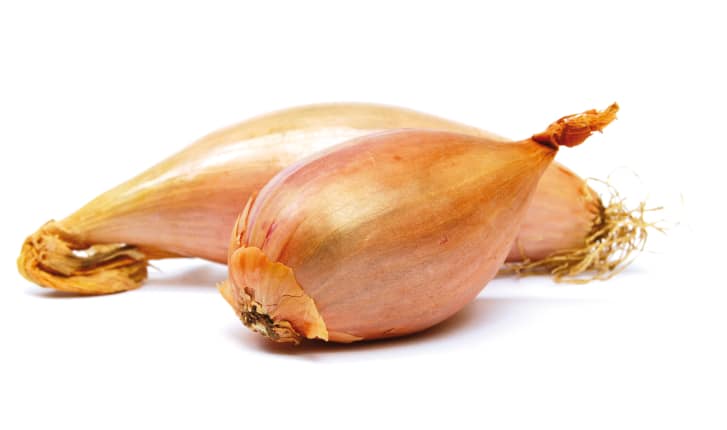 Une échalote ronde et une échalote longue sur fond blanc.