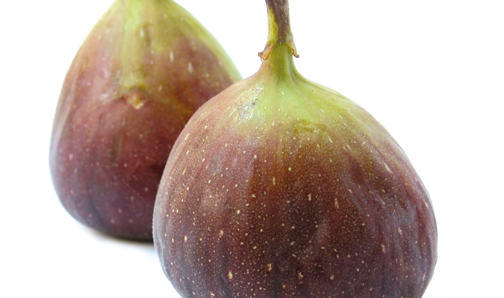 Deux ficgues rouges fraîches sur fond blanc.