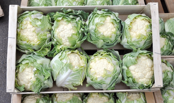 Chou-fleurs conditionnés en cagettes (vue de plongée) - Marché de gros - Colis prêt pour la livraison.
