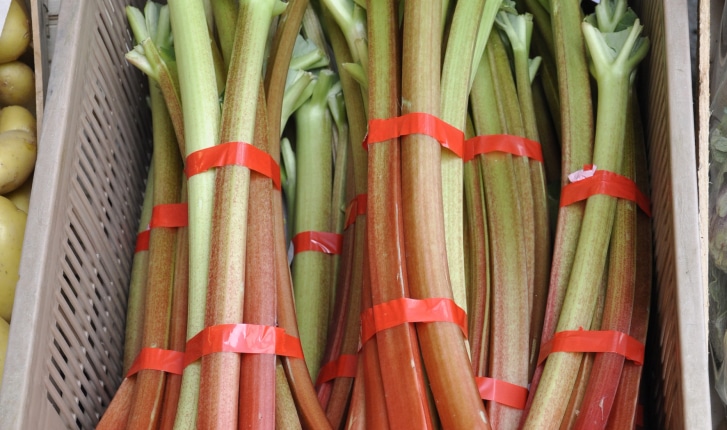 Marché de gros fruits et légumes - Colis de rhubarbe prêts pour livraison.