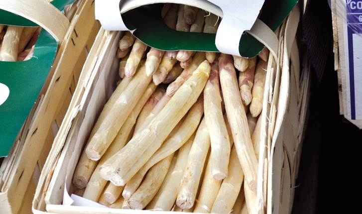 Marché de gros fruits et légumes – Colis d’aperges blanches prêts pour livraison.