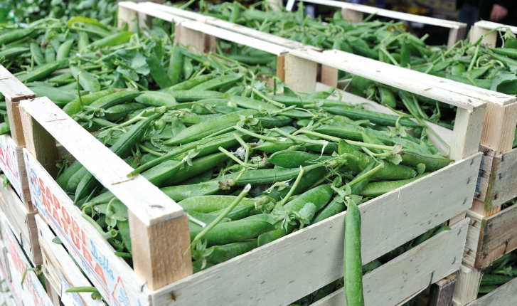 Marché de gros fruits et légumes - Caisses de petits pois frais à écosser.