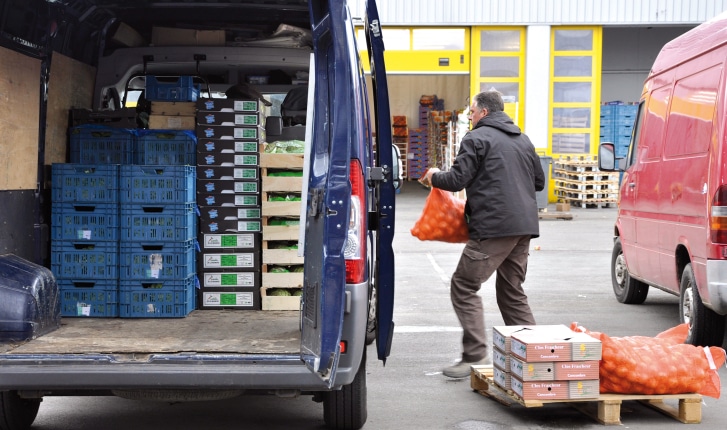 Marché de gros fruits et légumes - Manutention de colis de fruits et légumes - chargement d'une camionette pour livraison fruits et légumes